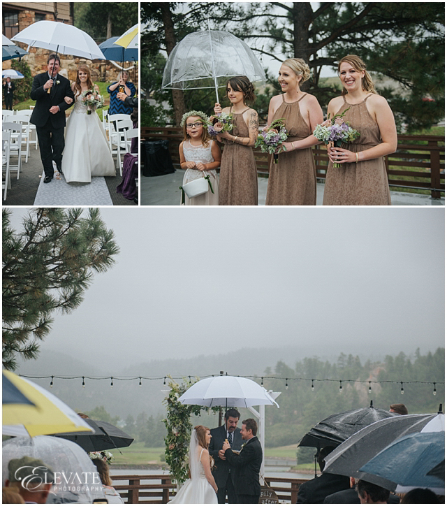 Donelle and Cory planned their dream wedding at a beautiful location, Perry Park Country Club. I was so excited to get to this venue that I had never been to before. The views were absolutely breathtaking and everything was so easy to get to! Donelle got ready upstairs in the cozy bridal suite. Her girls were dressed in lace trimmed robes, and they enjoyed mimosas and guacamole as they got ready. When it came time for Cory to see his bride, we also snuck his sweet daughter Elise into the mix. Elise was so happy for them, she couldn’t hold back the happy tears! The wedding party was a blast to photograph. They were so excited, happy and cold enough to listen to every instruction I had for them! We even had enough time to sneak off around the course with Donelle and Cory before their ceremony. Unfortunately we weren’t lucky enough to completely avoid the rain. However, Donelle and Cory invited all the right people to their wedding that loved them enough to stick it out! Something about all the smiling faces peeking out from under umbrellas made my heart so happy. Even with all the rain Donelle and Cory were up for anything. After their ceremony we whisked away in a beautiful blue car that Donelle’s Grandparents, and Parents drove away from their own weddings in. We spent a few minutes snuggled up under umbrellas, and rain jackets and it was definitely my favorite part of the day!