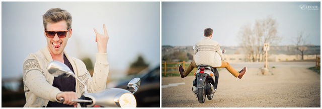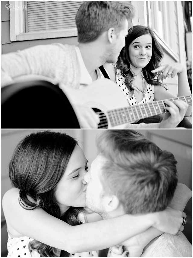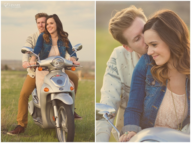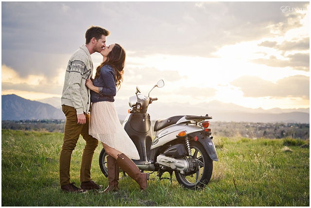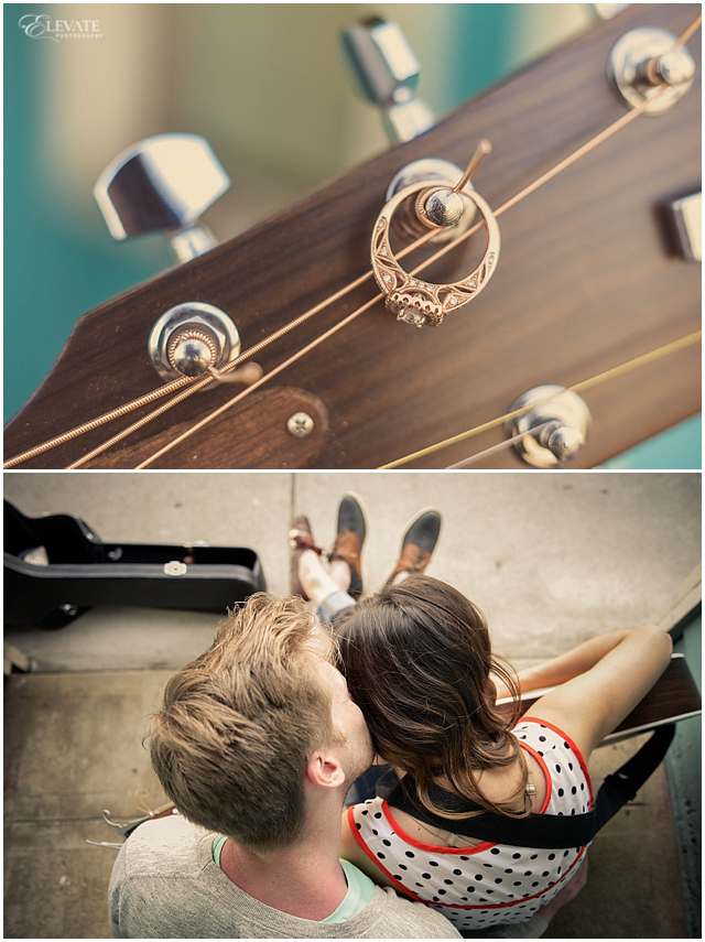 Jon and Danielle wanted their engagement photos to be as unique as they are, so they planned a scenario where their pictures would tell a fun story and flow chronologically. We actually sat down and came up with a storyboard for the shoot – that doesn’t happen often! SO, since Jon is a musician, they set the scene with him busking on the street. Danielle notices this handsome gentleman playing, flirts from afar, and then makes her move. They quickly fall in love as he teaches her to play the guitar, and then they run away together on her spiffy Moped. They ride through town, and then away into the sunset. Pretty dang perfect, right?!