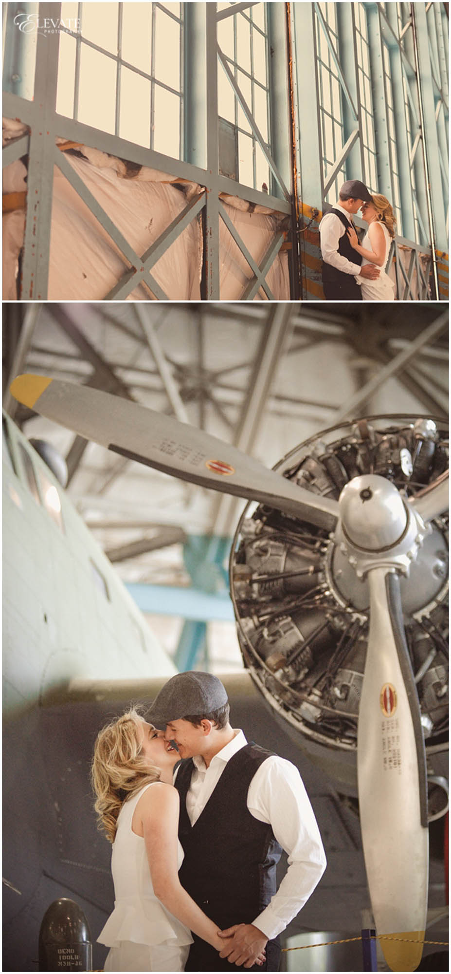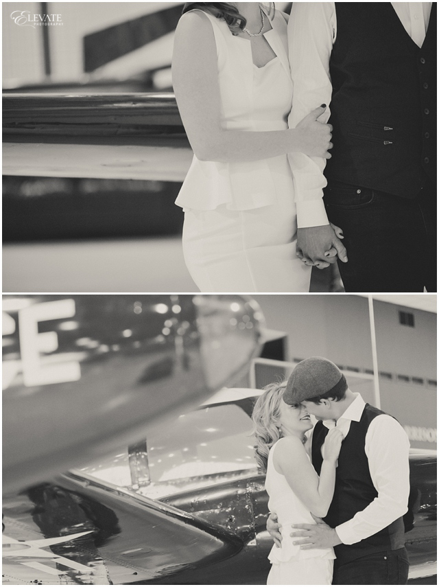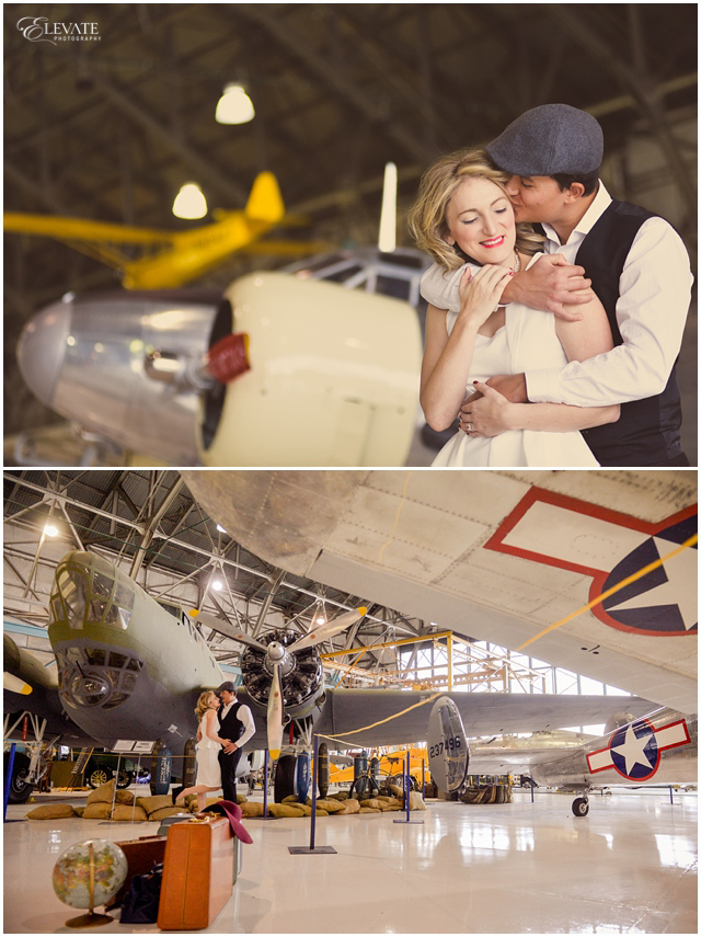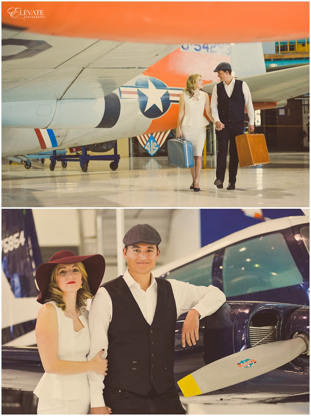 A word from the photographer: “Oh my GOSH, how cool are they?! These two have such natural chemistry and that combined with their impeccable style and ideas for the photos made this whole shoot pretty dang killer if you ask me. They pulled off the romantic old-hollywood look so well! Wings Over the Rockies Air & Space Museum was the perfect location for their travel theme. I can’t wait for their June wedding at Arrowhead Golf Club next year!”