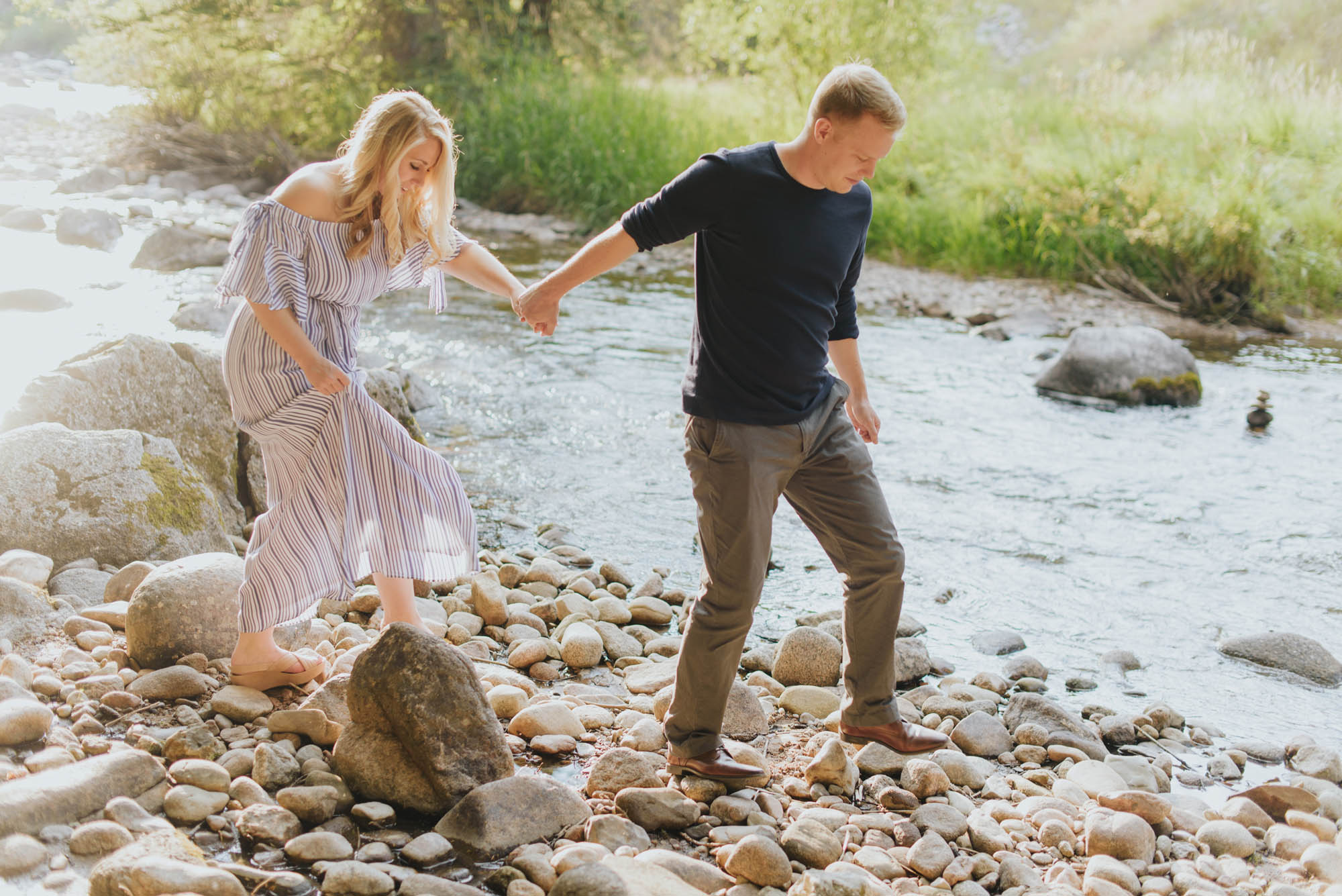 What an adventure I had with Aubree and Devin last week in Vail! I met up with them in Lionshead for a drink. Photographer’s secret to couples – have a beverage before your shoot and you’ll be sure to have fun 😉 We then hopped onto the gondola to the top of the world on Vail Mountain. It was a perfectly brisk afternoon at 11,000 ft! I loved her blue off the shoulder maxi dress. It complimented her beautiful blonde hair perfectly. It was also the perfect contrast with the rich greens of the evergreens and aspen.