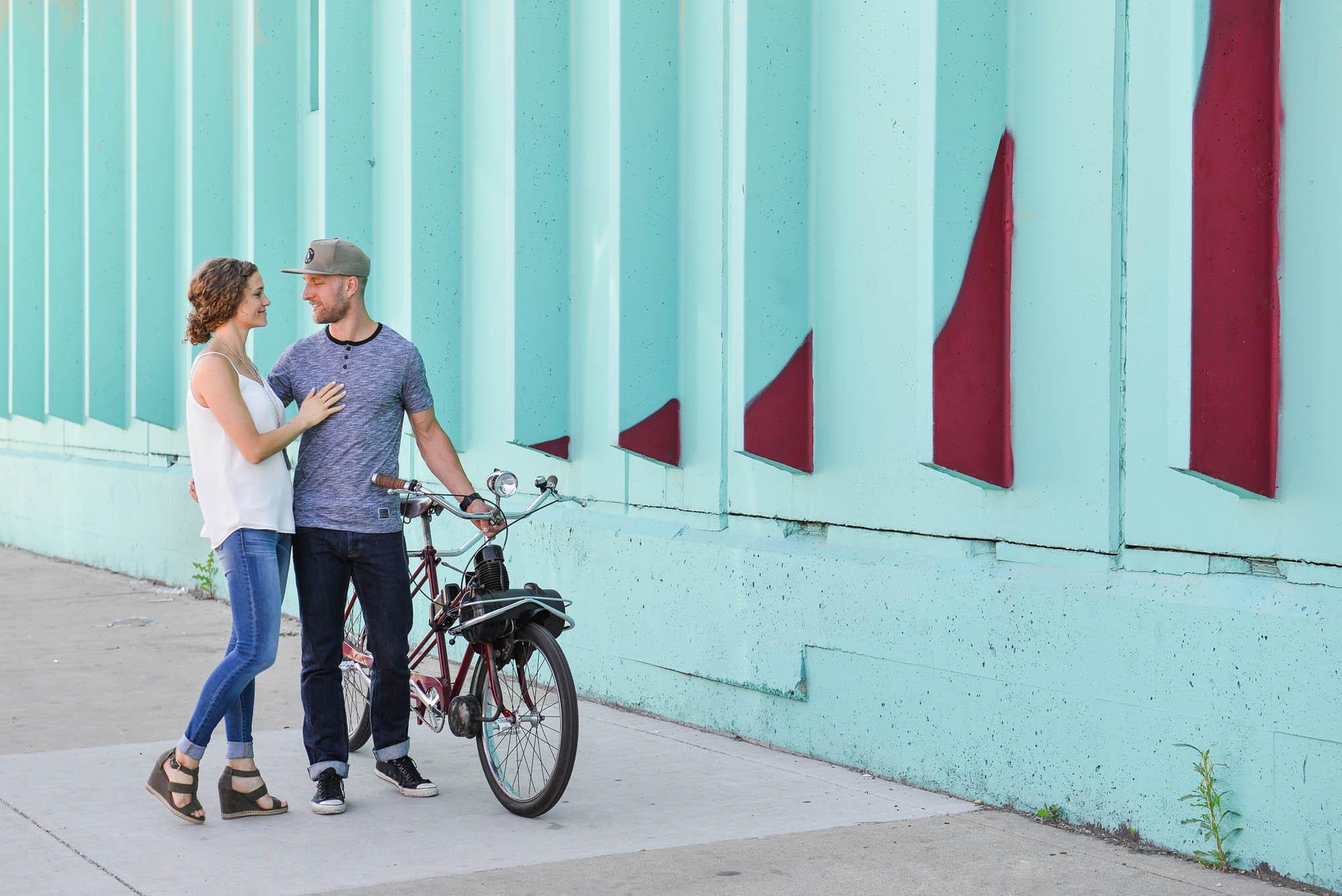It’s not every day that you get to hangout with a couple as cool as Jenna and Anthony and call it work. We started their session off at Denver Bicycle Cafe early on Saturday morning in attempts to beat the extreme heat we’ve been having in Denver lately, and it was so fun to switch things up for a morning session! Ever since Jenna and Anthony told me the story of their first date spent on bikes I’ve been begging them to bring bikes along for their shoot. They definitely did not disappoint! I was beyond excited to see their tandem bicycle that Anthony has been working on restoring – and it’s motorized!