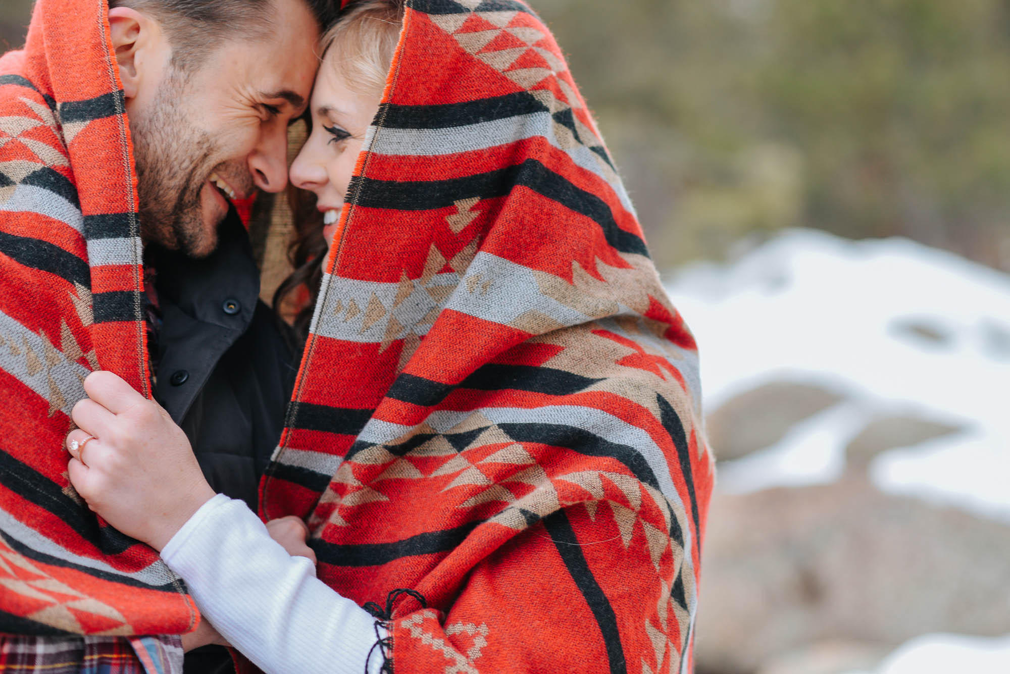 Man I love portrait sessions in the winter! The fresh blanket of snow makes a pure and clean backdrop. I loved how Leah and Brian brought a pop of color with her scarf and jacket. Did you catch that Leah is wearing heels in the snow?! I was fully impressed. Luckily she was able to switch into her duck boots as we ventured deeper into the woods of Evergreen. Can you see how sweet Brian is with her when they’re cuddled in close? That’s love folks!