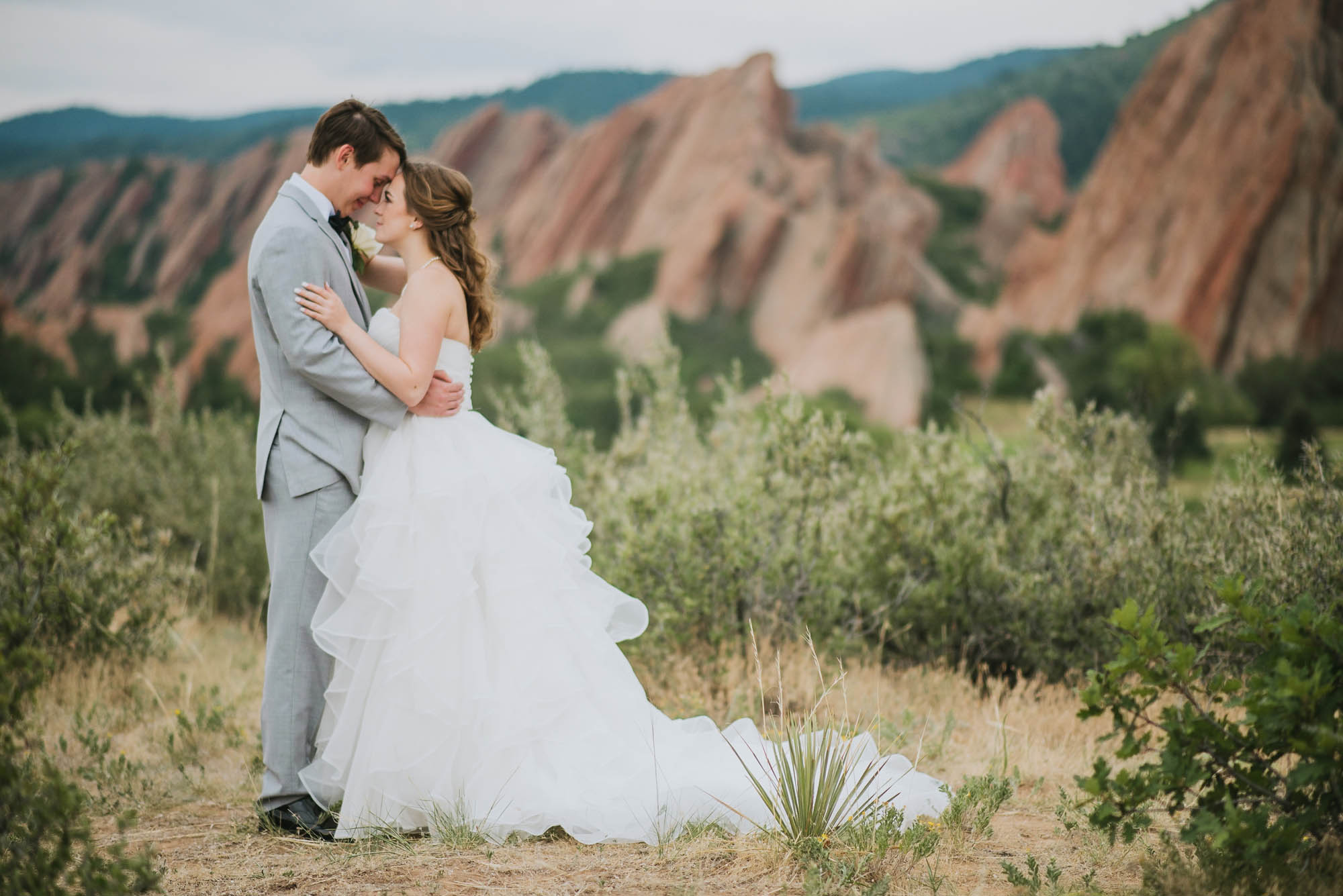 Madi and Mike are married! What a wonderful way to celebrate this great couple! After days of stormy clouds and rain, the sky opened up yet left Madison and Michael with a slightly cool and calm Colorado day. It was perfect as we started the day with their first look on top of the rocks overlooking all of Arrowhead Golf Course. Although I always worry that a bride won’t want to take the deer trail up there, once you get there the views are incredible. It is the perfect spot to exclaim their love.