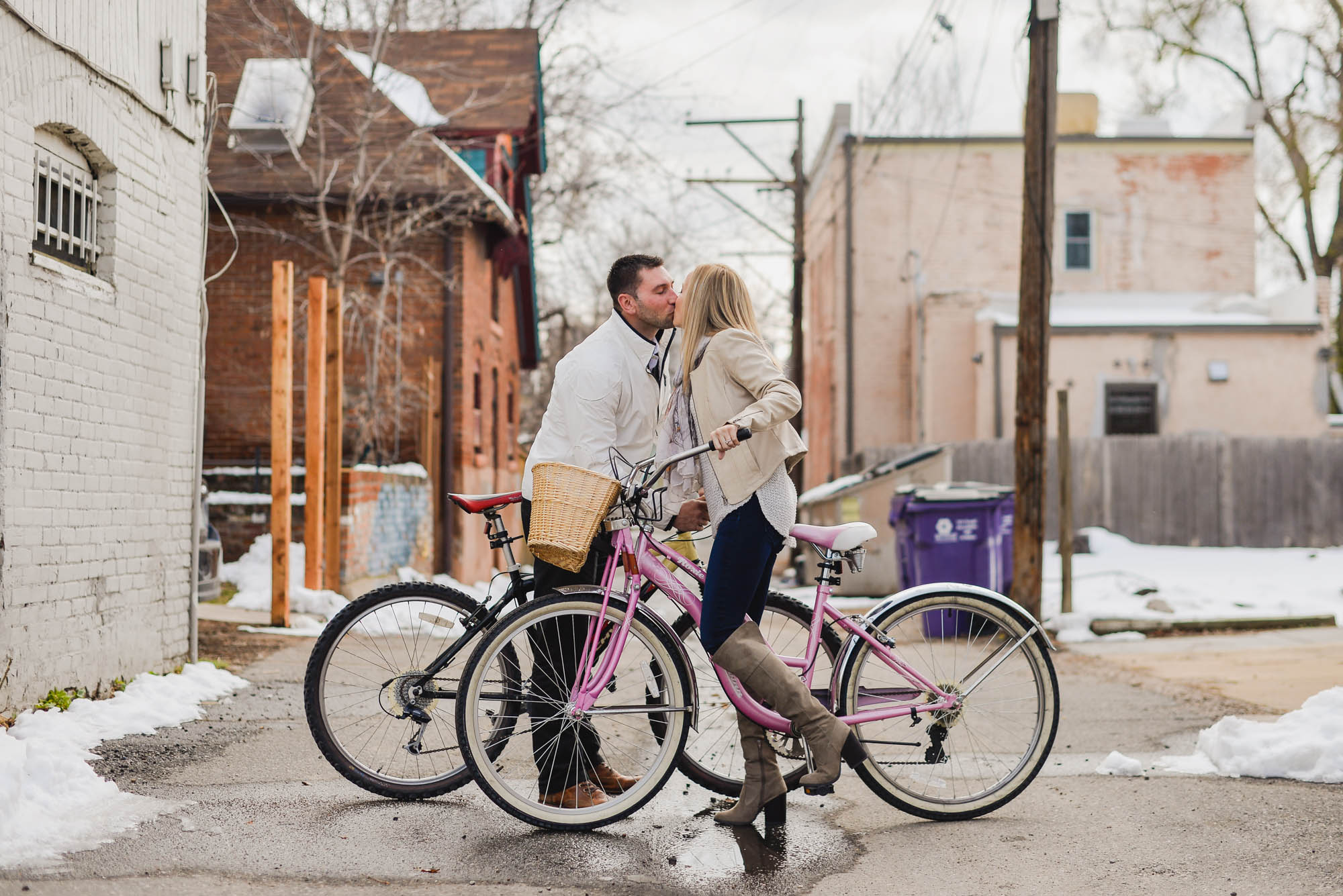 We started off in RiNo at Zev and Melissa’s super adorable home. Since they met while on a Denver Cruiser Ride, we just had to start of the shoot on their bikes. I LOVE Melissa’s classic pink ride! We then headed down to LoDo for some more modern/classic locations. It was fun walking down the ally where Zev used to live and watch many other couples get engagement photos taken. We grabbed a quick drink at the Terminal Bar before heading just outside the city for a magical snowy sunset. Seriously, couldn’t have been a better day.