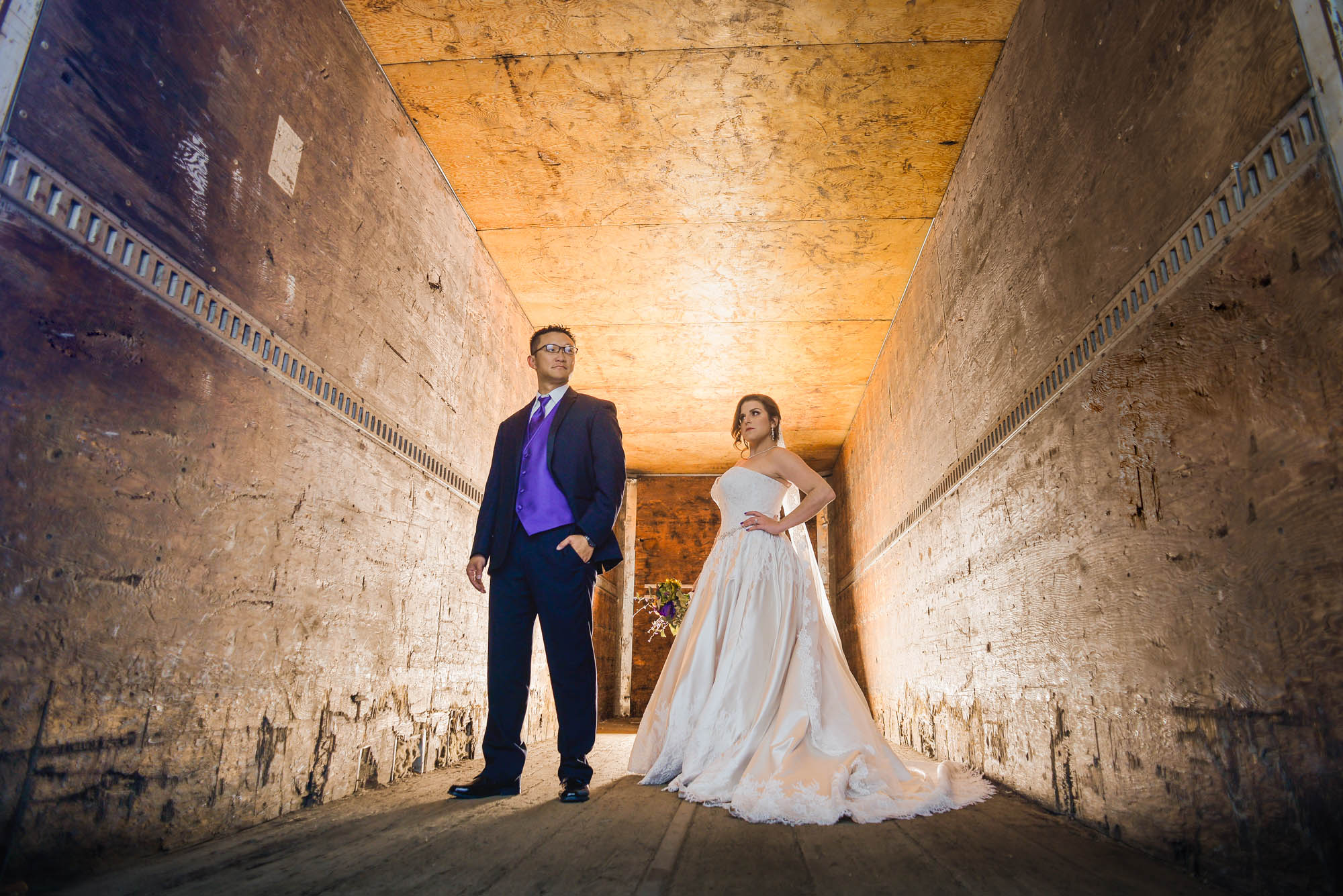 Allie and I started out at The Bella Sera and then met up at a nearby warehouse with the perfect contrast to their wedding party.  This was definitely the first time photographing a couple standing on a stack of wood palettes!  Ondrea surprised me when I joked about jumping up into the back of a semi truck for photos.  Without missing a beat Ondrea said, “Give me a hand up!”  Check out the final shot to see how awesome these two look together!