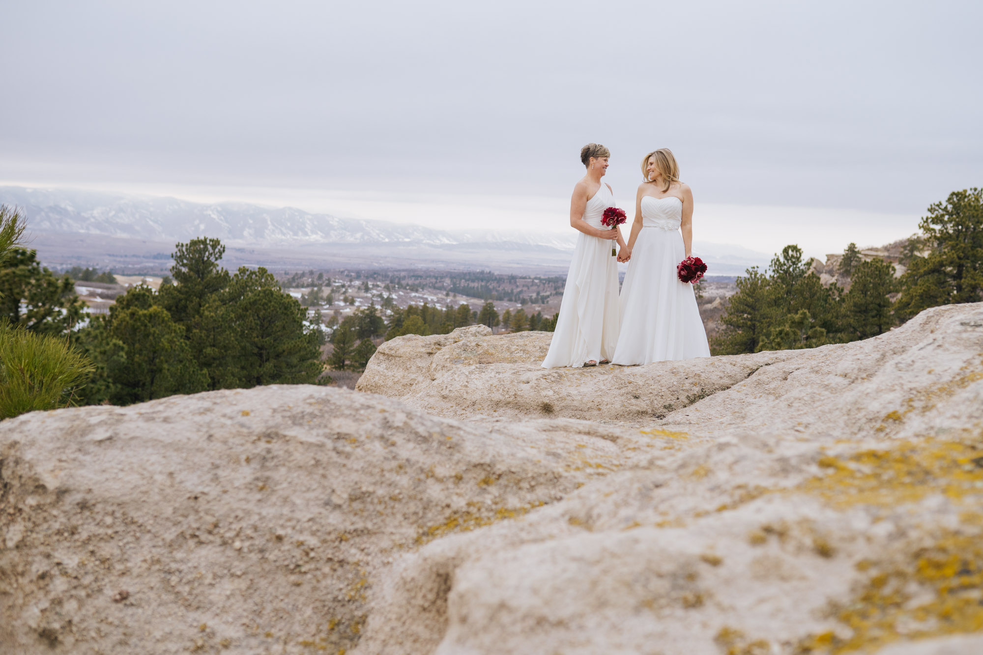 I’m so happy to share Laura and Tonia’s wedding with you all! They married at Sanctuary Golf Course last week and partied down with their closest friends and family. I loved how the day started out in the grand hallway where they both got dressed blindly next to each other. So pretty right? After sharing a few happy tears, we roamed out into the Winter air to explore some of the views that Sanctuary offers. It warmed my heart to learn more about their story and their connection during the ceremony. Colleen is their dear friend who officiated the ceremony. She led Laura and Tonia’s family to present a collection of glass sphere’s to represent their bond becoming stronger and to acknowledge those family members no longer with us. It was a teary moment for sure!