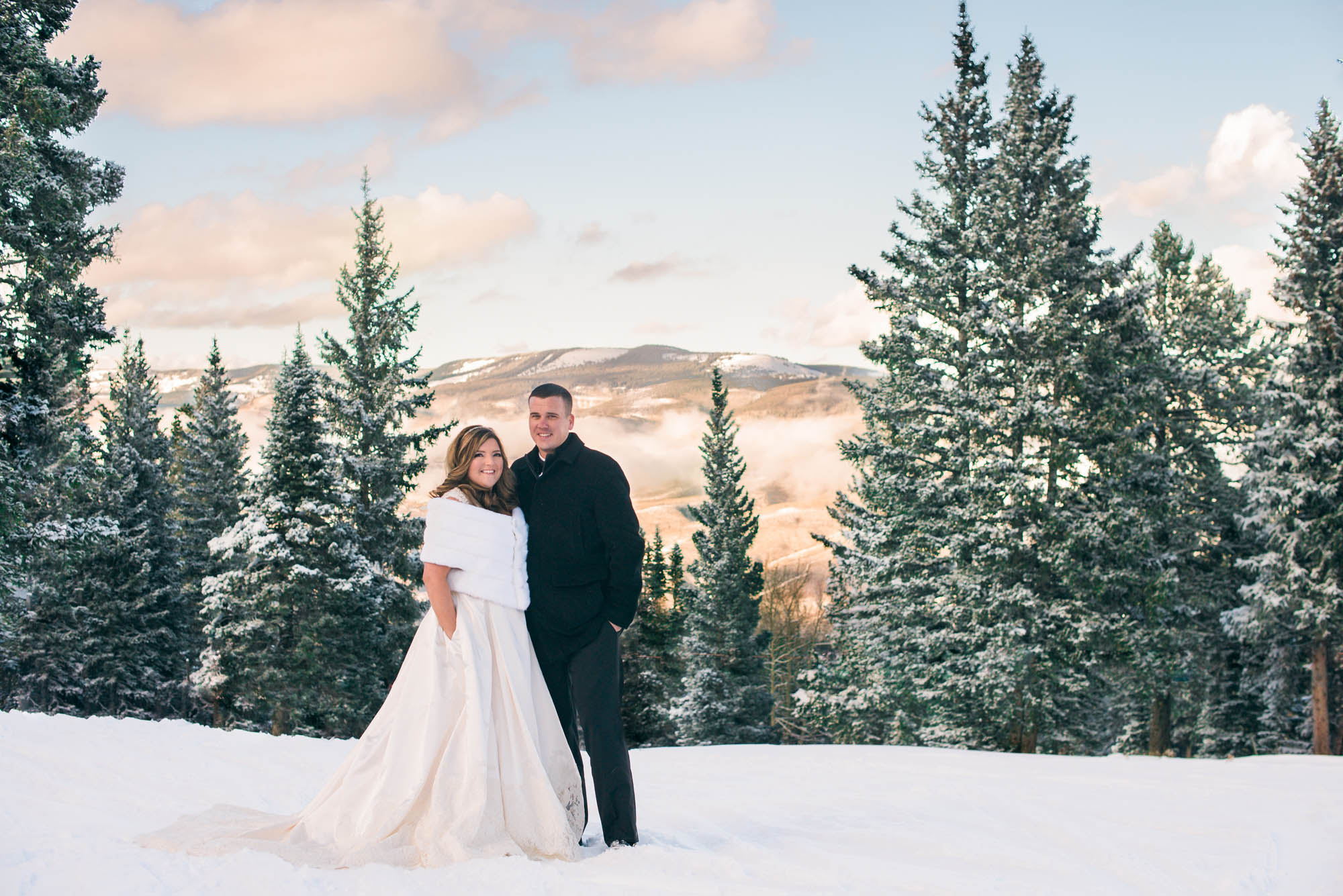 I have been looking forward to Julie and Steven’s wedding for so long, I can’t believe it finally happened and now I get to share these awesome photos! They really planned the perfect winter destination wedding. Beaver Creek couldn’t be prettier than during this time of the year, and all of the guests had a great attitude about the chilly weather – even though most traveled in from Texas. There were a few little snow storms on their wedding day, but every time that we were ready to start photos, it cleared up leaving a fresh layer of powder – so super pretty! I felt really bad that Steven had to go “hiking” in sometimes KNEE-deep snow in his tuxedo shoes, but he handled it like a champion and every frozen moment was worth it for the epic views that we got for the first look at the top of the mountain.