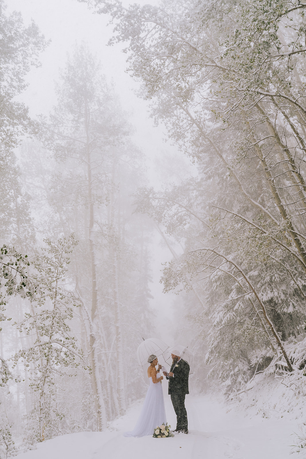 Husband and wife candid wedding portraits in Aspen during a snow storm