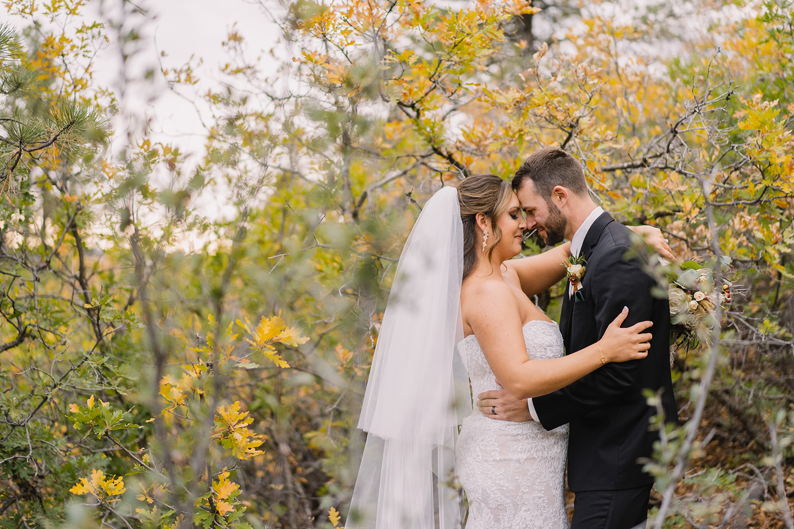 Bride and groom after wedding ceremony photos at Cielo at Castle Pines in fall